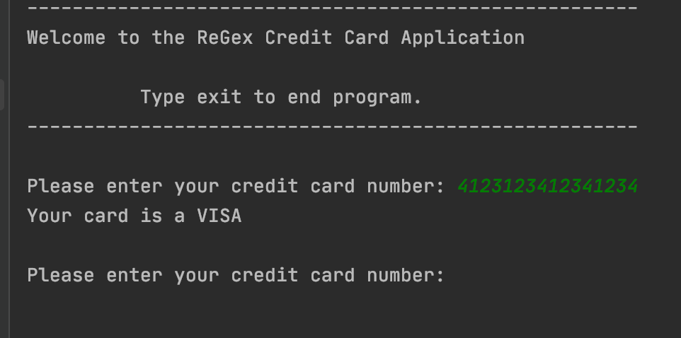 The Regex Credit Card Application will prompt a user to input their credit card numbers. The program will verify the credit card number and report credit card issuer to the user based off the number formatting.